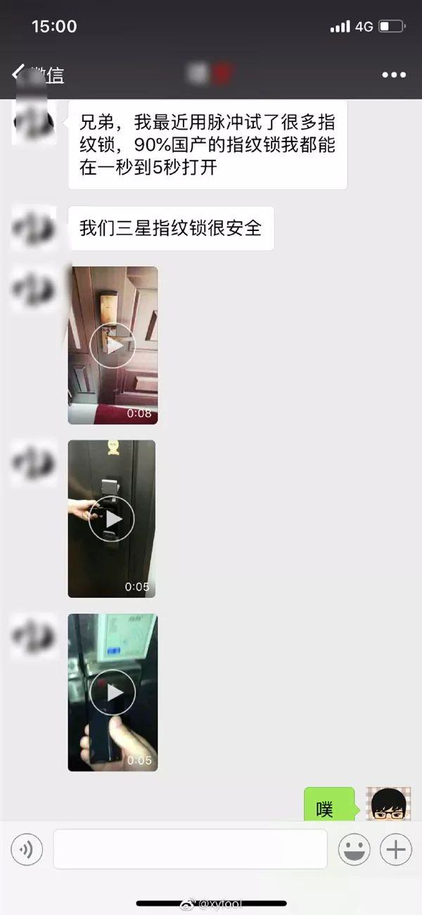 同樣在該網友的微信聊天記錄中,我們看到,其朋友表示“90%國產的智能鎖都能在1-5秒打開?!?