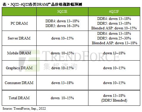 據(jù)TrendForce集邦咨詢研究顯示,在高通脹影響下,消費(fèi)性產(chǎn)品需求疲軟,旺季不旺,第三季存儲(chǔ)器位元消耗與出貨量持續(xù)呈現(xiàn)季減,各終端買方因存儲(chǔ)器需求明顯下滑而延緩采購(gòu),導(dǎo)致供應(yīng)商庫(kù)存壓力進(jìn)一步升高。同時(shí),各DRAM供應(yīng)商為求增加市占的策略不變,市場(chǎng)上已有「第三、四季合并議價(jià)」或「先談量再議價(jià)」的情形,皆是導(dǎo)致第四季DRAM價(jià)格跌幅擴(kuò)大至13~18%的原因。