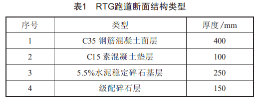 南通通海危險(xiǎn)品箱堆場工程地處南通市海門經(jīng)濟(jì)開發(fā)區(qū)、新通海沙河段北岸、蘇通大橋下游側(cè),其上游距蘇通大橋約3.0km,具體位置在已建成并投入運(yùn)營的南通港通海港區(qū)中作業(yè)區(qū)一期工程后方陸域緯一路至緯二路之間,經(jīng)五路往東第二塊堆場。該堆場項(xiàng)目緊臨長江,平面布置呈長方形,并通過緯一路和緯二路與一期工程連接,未來主要用于危險(xiǎn)品箱的存放。堆場陸域總面積9.18萬m2,東西方向長333m,南北方向縱深285m。建設(shè)任務(wù)主要有危險(xiǎn)品箱堆場、道路、調(diào)節(jié)沉淀池、污水收集池以及其他輔助設(shè)施等。RTG跑道共有4組8條,每條長234m、寬1.5m,分別由級配碎石層、5.5%水泥穩(wěn)定碎石基層、C15素混凝土墊層及C35鋼筋混凝土面層組成,各結(jié)構(gòu)厚度如表1所示。