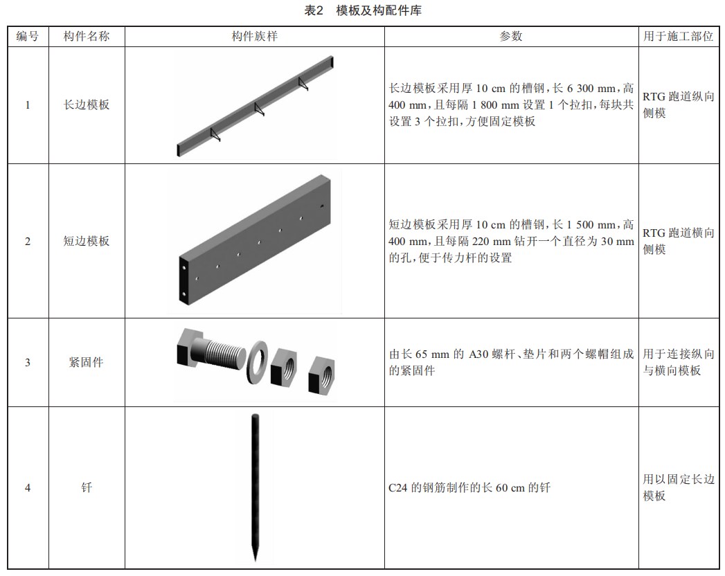 結(jié)合本工程項(xiàng)目的具體情況,應(yīng)用Revit中的族庫文件系統(tǒng),分別繪制RTG跑道模板及配套輔助構(gòu)件。相應(yīng)的模板及構(gòu)配件參數(shù)具體如表2所示。
