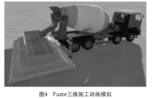 將用Revit軟件繪制的單倉(長6100mm、寬1500mm)導(dǎo)入Fuzor軟件,應(yīng)用Fuzor軟件自有材質(zhì)庫,加載相應(yīng)的施工機(jī)械設(shè)備,制作三維動(dòng)畫,模擬現(xiàn)場施工工藝流程,如圖4所示。輔助對現(xiàn)場施工班組的技術(shù)交底,能夠讓施工班組更清晰地了解RTG跑道相應(yīng)施工工藝流程和質(zhì)量管控要點(diǎn),避免因?yàn)閷κ┕すに嚵鞒滩皇煜?、管控要點(diǎn)不清楚,顛倒施工先后順序,導(dǎo)致不必要的返工,影響施工進(jìn)度。