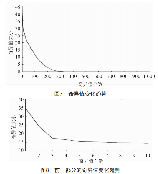 隨后對(duì)S變換后得到的時(shí)頻域矩陣進(jìn)行奇異值分解,得到S、V、D三個(gè)矩陣。其中,V矩陣的奇異值變化趨勢(shì)如圖7所示。