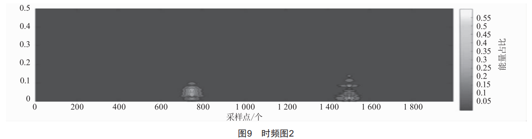 再對(duì)初步濾除噪聲后的信號(hào)y1進(jìn)行S變換,得到其時(shí)頻域圖,如圖6所示。從圖6可以看出,大部分能量主要集中在第700~800個(gè)和第1400~1600個(gè)采樣點(diǎn)中,而其他點(diǎn)所含有的能量較小,說(shuō)明有效信號(hào)主要位于[700,800]和[1400,1600]所在的采樣點(diǎn)區(qū)間內(nèi)。
