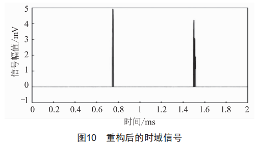 從圖7可以看出,奇異值集中在前200個(gè)點(diǎn)內(nèi)。再對(duì)前一部分奇異值點(diǎn)繼續(xù)做趨勢(shì)圖,如圖8所示。取第二個(gè)奇異值為閾值,對(duì)該信號(hào)進(jìn)行濾波處理。濾波處理后,將其重構(gòu)為時(shí)頻域矩陣,繪制的時(shí)頻圖如圖9所示。由圖9可以明顯看出,只留下了兩個(gè)能量較高的采樣點(diǎn)區(qū)域,經(jīng)過去噪,大部分噪聲已被去除。隨后又對(duì)去噪后的時(shí)頻域矩陣進(jìn)行逆S變換,將其重構(gòu)為時(shí)域信號(hào)。該時(shí)域信號(hào)如圖10所示,不難看出,經(jīng)過去噪后,重構(gòu)的時(shí)域信號(hào)與原始信號(hào)的相位和時(shí)間保持一致。