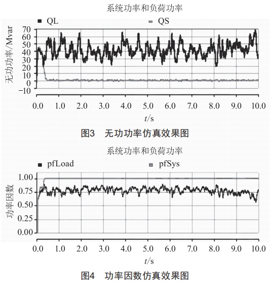 為了證明該新型動態(tài)無功補償裝置控制系統(tǒng)設(shè)計的有效性,選擇系統(tǒng)無功控制方式進行仿真,仿真對象為某220kV變電站,控制目標值為220kV側(cè)功率因數(shù)l.0,仿真結(jié)果如圖3、圖4所示。