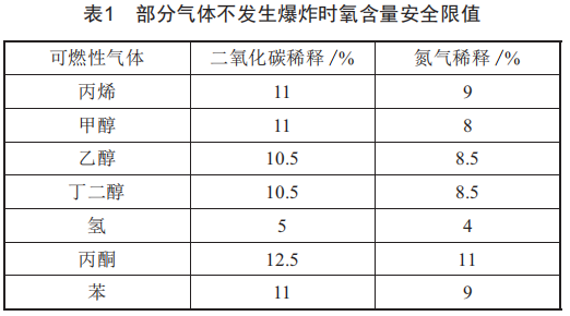 從表1中可以看出,大部分可燃溶媒氧含量安全限值在8%~11%(體積分數(shù)),可以理解為,若將設備內(nèi)氣相空間的氧含量控制在8%以內(nèi),就可保證大多數(shù)可燃溶媒不發(fā)生燃燒。如離心機廠家通常將離心機內(nèi)氧含量安全值設置為4%~6%,就是依據(jù)此原理。