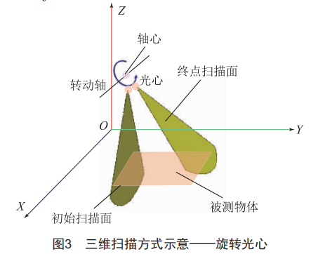 如圖3所示,激光器光心沿與X軸平行的方向掃描,同時(shí)轉(zhuǎn)動(dòng)軸繞X軸旋轉(zhuǎn),這樣就可以取得被測(cè)物體的三維輪廓。在這種掃描方法下,轉(zhuǎn)動(dòng)軸的角分辨率與激光器的掃描頻率有關(guān),忽略光速導(dǎo)致的偏差后,其對(duì)應(yīng)關(guān)系為: