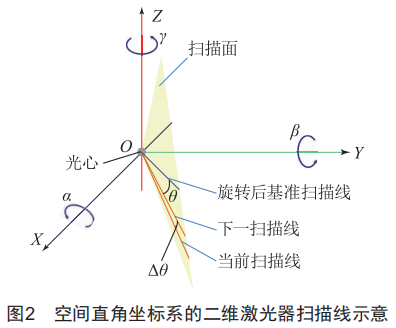 忽略二維激光器發(fā)射器和接收器的相對(duì)位置,即定義接收位置為光心,實(shí)際掃描線會(huì)繞X軸、y軸、Z軸旋轉(zhuǎn)角度。定義3個(gè)軸的旋轉(zhuǎn)角度分別為α、8、y,掃描角為9,角精度A9。以沿X軸掃描為例,光心位置為原點(diǎn),在空間直角坐標(biāo)系中相鄰掃描線如圖2所示。