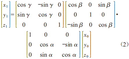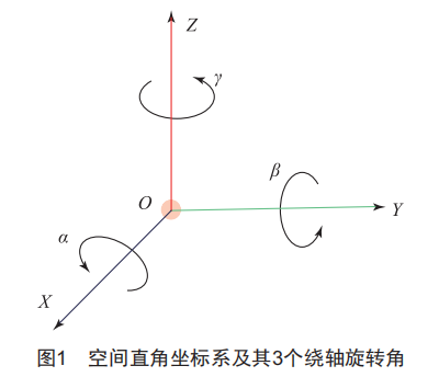 首先對(duì)空間建立空間直角坐標(biāo)系并定義其繞3個(gè)坐標(biāo)軸旋轉(zhuǎn)的方向角分別為a、8、y,如圖1所示。