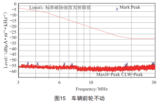 第一步:斷車輛低壓電,輪轂帶動(dòng)車輛,速度40km/h,測(cè)試頻段3~30MHz,測(cè)試結(jié)果如圖7所示。