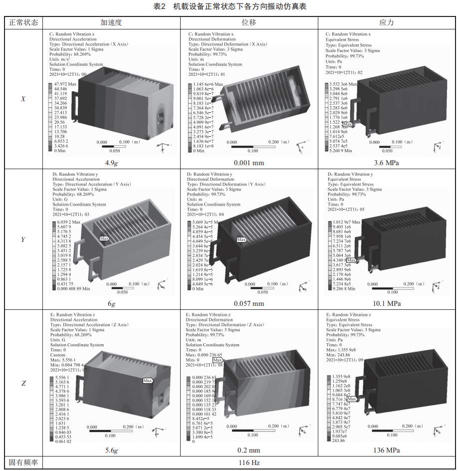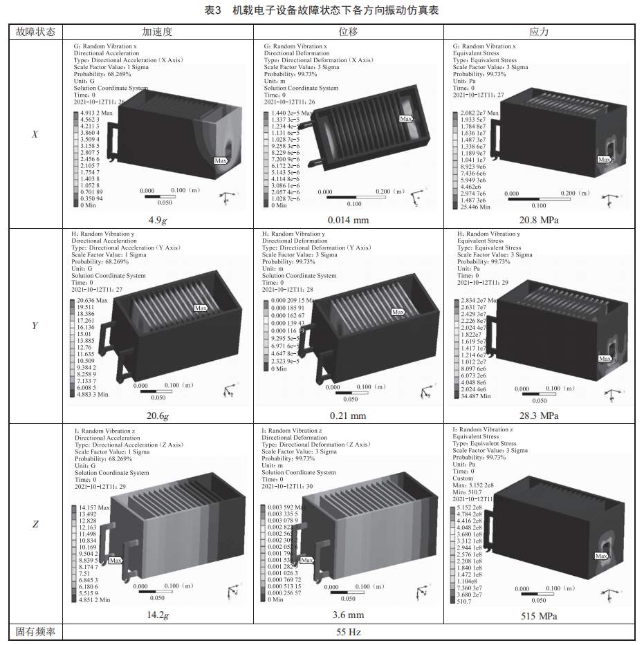 以上仿真驗證了在安裝架前后緊定松動情況下,結(jié)構(gòu)件最大應(yīng)力發(fā)生在機箱后矩形連接器,其最大應(yīng)力超過材料極限強度,會發(fā)生振動失效。此狀態(tài)下機箱內(nèi)部模塊最大振動變形小于許用值,滿足振動壽命要求,不會發(fā)生損傷。說明安裝架前后緊定松動狀態(tài)只會對后矩形連接器造成破壞影響,但不會影響到其他部件。
