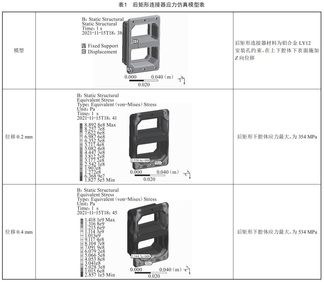 從表1可看出,后矩形連接器施加向下的位移約束,最大受力部位在下腔體下表面,與裂紋位移一致。當位移a.700時,最大應(yīng)力小于材料的強度極限m4aMPa,有1.m3倍的安全余量:當位移a.400時,最大應(yīng)力與材料的強度極限接近,有斷裂的風險。說明后矩形安裝尺寸在±a.700內(nèi)受力正常,不會產(chǎn)生斷裂,若尺寸超過公差范圍,后矩形有斷裂的風險。