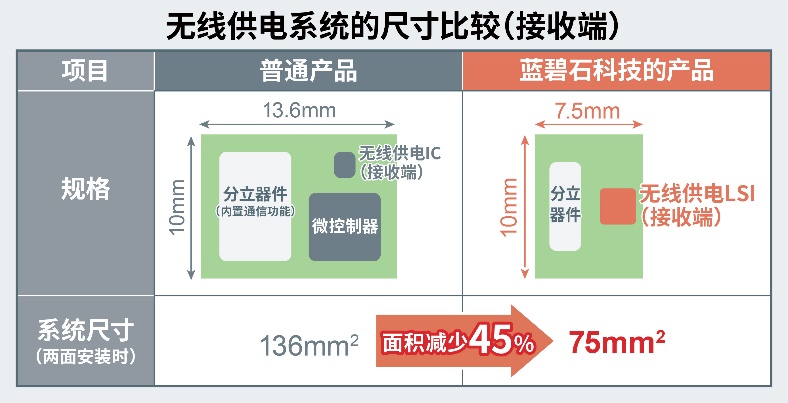 藍(lán)碧石科技的無線供電芯片組內(nèi)置供受電所需的控制電路,可實(shí)現(xiàn)系統(tǒng)的小型化,同時(shí),無需用戶開發(fā)微控制器程序,有助于縮短開發(fā)周期。此外,供受電頻率采用與NFC標(biāo)準(zhǔn)相同的13.56MHz頻段,這將有助于天線的小型化。