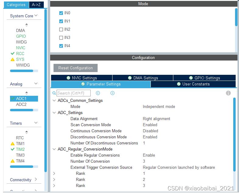 首先在cubemx里配置ADC,打開(kāi)AD0、AD1和AD4(實(shí)際只用了AD0和AD1,AD4是預(yù)留的,采集了但是沒(méi)有用于計(jì)算),分別配置到圖中的rank1、rank2、rank3下: