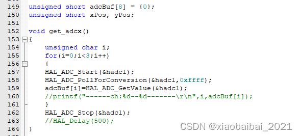在keil工程里,adc部分,使用如下函數(shù)進(jìn)行AD采集,采集了三個(gè)通道,即AD0、AD1、AD4: