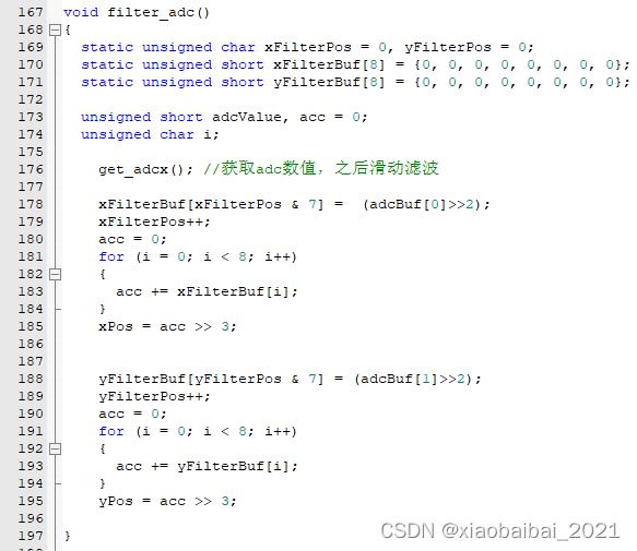 然后進(jìn)行滑動(dòng)平均濾波,這里最終只保留了AD0和AD1兩路,10bit的精度,存放到了xPos和yPos中,作為兩個(gè)方向的位置值。