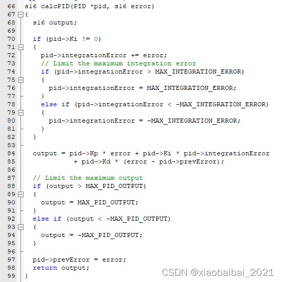 注意這里PID實(shí)現(xiàn)時(shí)對(duì)積分項(xiàng)的處理,當(dāng)誤差的累加值非常大時(shí)(也即積分項(xiàng)很大時(shí))不會(huì)再累加誤差項(xiàng),而是限制到一個(gè)最大值MAX_INTEGRATION_ERROR,這是一種避免積分飽和的方法。(關(guān)于PID的積分飽和,可以參見(jiàn)小白白以前發(fā)的文章《PID控制的深入探討(位置式PID、增量式PID、PID的積分飽和)》)