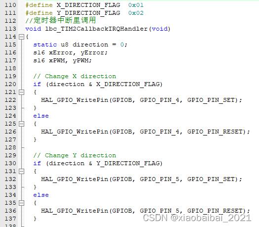 這部分的實(shí)現(xiàn)代碼如下,其中PWM1和PWM3的輸出值(也就是代碼中的xPWM和yPWM),是先通過(guò)調(diào)用PID計(jì)算函數(shù)得出值,再依據(jù)正負(fù)向設(shè)置到定時(shí)器的PWM輸出的,整個(gè)函數(shù)放在定時(shí)器中斷中調(diào)用。