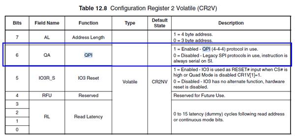 當(dāng)然也有一些廠商不是發(fā)一個(gè) CMD 命令時(shí)序來切換的設(shè)計(jì),而是通過設(shè)置 Flash 內(nèi)部寄存器的方式來做切換,比如賽普拉斯 S25FS-S 系列就是設(shè)置如下的寄存器來進(jìn)入和退出 QPI 模式: