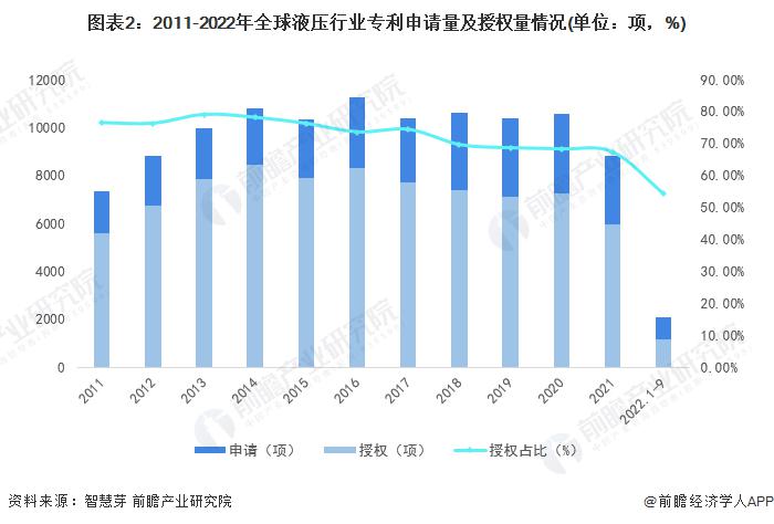 2022年1-9月,全球液壓行業(yè)專利申請數(shù)量和專利授權(quán)數(shù)量分別為2108項(xiàng)和1146項(xiàng),授權(quán)比重為54.36%。截至2022年9月7日,全球液壓行業(yè)專利申請數(shù)量為27.4萬項(xiàng)。
