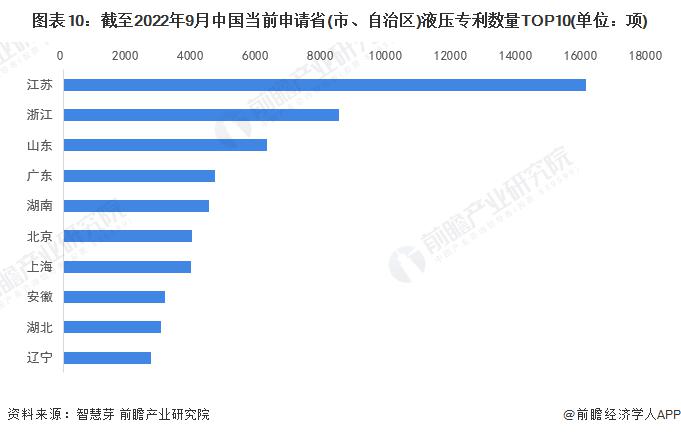 在中國各個(gè)區(qū)域?qū)@暾埩糠矫妫K省為中國當(dāng)前申請液壓專利數(shù)量最多的省份,累計(jì)液壓專利申請數(shù)量高達(dá)1.6萬項(xiàng)。排名第二的是浙江省,累計(jì)液壓專利申請數(shù)量為8461項(xiàng)。排名前十位的省市還有山東省、廣東省、湖南省、北京市等。