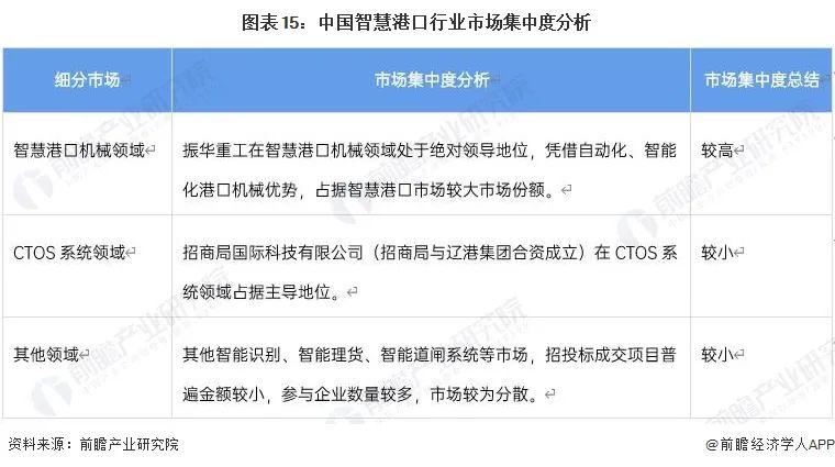 從不同領(lǐng)域看,振華重工在智慧港口機(jī)械領(lǐng)域處于絕對(duì)領(lǐng)導(dǎo)地位,憑借自動(dòng)化、智能化港口機(jī)械優(yōu)勢(shì),占據(jù)智慧港口市場(chǎng)較大市場(chǎng)份額;招商局國(guó)際科技有限公司(招商局與遼港集團(tuán)合資成立)在CTOS系統(tǒng)領(lǐng)域占據(jù)主導(dǎo)地位;無(wú)人集卡、無(wú)人AGV由于技術(shù)仍處于試驗(yàn)階段,成交項(xiàng)目較少,相關(guān)企業(yè)的市占率較低。其他智能識(shí)別、智能理貨、智能道閘系統(tǒng)等市場(chǎng),成交項(xiàng)目普遍金額較小,參與企業(yè)數(shù)量較多,市場(chǎng)較為分散。