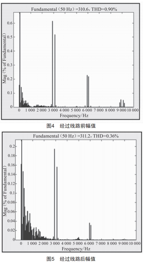 本文仿真模擬了超高次諧波經(jīng)過線路時(shí)的傳遞情況,如圖3、圖4、圖5所示。