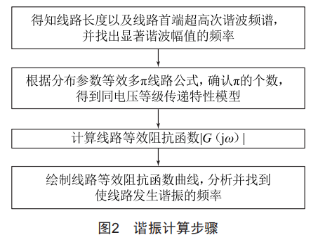測(cè)算超高次諧波在線路上諧振的方法如圖2所示,具體方法為:將線路電路模型簡(jiǎn)化成多m型等值電路,根據(jù)簡(jiǎn)化后的線路電路模型,求取線路等效阻抗,并繪制線路等效阻抗函數(shù)曲線,根據(jù)曲線找到使線路發(fā)生諧振的諧波次數(shù)。