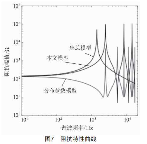 利用所求得的線路阻抗函數(shù)可進(jìn)行函數(shù)圖線繪制,同時(shí)將其與集總參數(shù)模型和分布參數(shù)模型的阻抗函數(shù)圖線進(jìn)行對(duì)比,如圖7所示。
