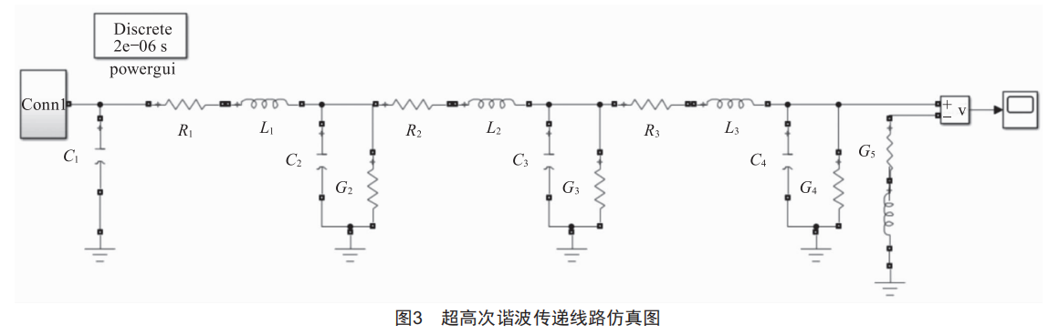 當(dāng)線路長(zhǎng)度大于諧波1/30的波長(zhǎng)時(shí)鵬線路電壓、電流波動(dòng)明顯。根據(jù)這個(gè)規(guī)則鵬需要得到線路長(zhǎng)度l鵬線路首端超高次諧波頻譜鵬以此根據(jù)式(1)、式(2)確定m型等效電路的個(gè)數(shù)。