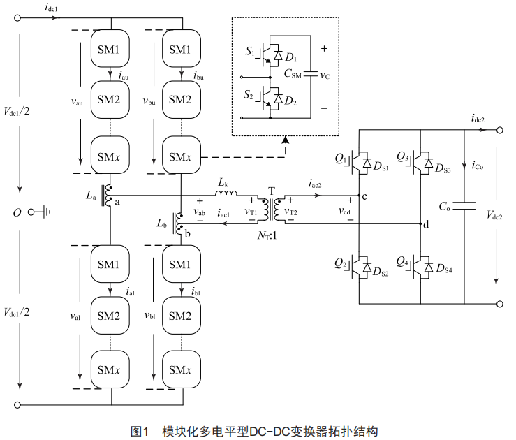 可再生能源的大規(guī)模開發(fā)與利用、直流負(fù)荷的增多以及城市配電結(jié)構(gòu)需求的多樣性使得直流配電網(wǎng)成為當(dāng)前研究的熱點。DC-DC變換器作為直流配電網(wǎng)中的關(guān)鍵元件,起到了不同直流電壓等級間互聯(lián)、負(fù)荷接入等作用。模塊化多電平型DC-DC變換器因具有可擴(kuò)展性強(qiáng)、功率等級高與輸入/輸出側(cè)電氣隔離等優(yōu)點而適用于中壓直流配電網(wǎng)。