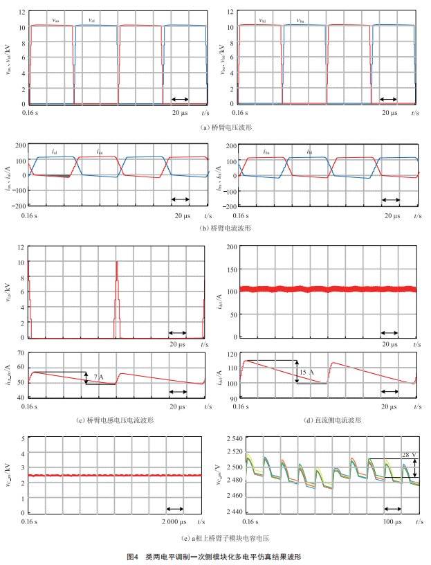 圖4(a)為類兩電平調(diào)制NCS工作模式下一次側(cè)模塊化多電平穩(wěn)態(tài)運行時各橋臂電壓/電流波形,橋臂電壓過渡階段階梯數(shù)為3:圖4(b)為橋臂電流波形:在過渡階段橋臂電感被施加階梯變化的電壓,如圖4(4)所示,該電壓起到調(diào)節(jié)橋臂直流電流紋波的作用:在圖4(d)中橋臂電流直流分量紋波頻率為開關(guān)頻率的2倍,其紋波峰峰值為7A,直流側(cè)電流id4l穩(wěn)態(tài)值約為l05A,其紋波峰峰值為l5A,紋波系數(shù)ī約為0.l4,滿足小于0.2的要求:仿真中采用脈沖循環(huán)法控制子模塊電容電壓的平衡,本處給出a相上橋臂電容電壓仿真結(jié)果如圖4(e)所示,可見平衡效果良好,對其進(jìn)行區(qū)域放大,得到各個橋臂電容電壓紋波峰峰值為28V,紋波系數(shù)c最大值僅為l.24%,滿足小于5%的要求。