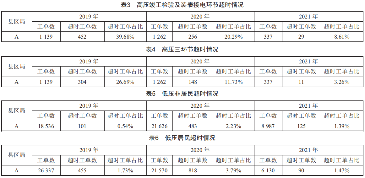 (3)高壓業(yè)擴(kuò)報(bào)裝竣工檢驗(yàn)及裝表接電環(huán)節(jié),如表3所示,2019年辦理超時限452單,占比39.68%:2020年辦理超時限256單,占比20.29%:2021年至今辦理超時限29單,占比8.61%。工單超時主要原因包括:一是用戶工程竣工檢驗(yàn)不合格,需重復(fù)檢驗(yàn):二是部分客戶為避免過早投運(yùn)多交基本電費(fèi),在竣工驗(yàn)收合格過后申請延期送電:三是客戶投產(chǎn)計(jì)劃推遲,申請延遲接火送電時間:四是綜合停電(帶電)計(jì)劃與客戶實(shí)際用電計(jì)劃有差異,對于涉及多個項(xiàng)目的用戶接入工程,其送電時間會受其他項(xiàng)目影響:五是部分用戶接入工程帶電作業(yè)排期緊張,導(dǎo)致用戶工程延期接入。