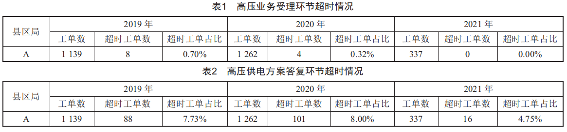 (1)高壓業(yè)擴(kuò)報(bào)裝業(yè)務(wù)受理環(huán)節(jié),如表1所示,2019年辦理超時限8單,占比0.70%:2020年辦理超時限4單,占比0.32%:2021年至今辦理超時限0單。工單超時的主要原因是工單受理信息有誤,勘察人員發(fā)現(xiàn)后跳轉(zhuǎn)工單至一口受理環(huán)節(jié)修改信息。