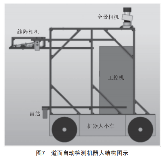 深度學(xué)習(xí)需要大量的數(shù)據(jù)進(jìn)行訓(xùn)練,故首先通過自研的道面自動(dòng)檢測機(jī)器人從機(jī)場收集數(shù)據(jù)。如圖7所示,機(jī)器人主要由機(jī)器人小車、線陣相機(jī)、全景相機(jī)、雷達(dá)以及工控機(jī)組成,其中線陣相機(jī)負(fù)責(zé)采集道面的圖像數(shù)據(jù),圖像數(shù)據(jù)的尺寸為2048×2048:工控機(jī)負(fù)責(zé)機(jī)器人小車的自動(dòng)/遠(yuǎn)程控制以及采集圖片的預(yù)處理。機(jī)器人采集的圖像如圖8所示。