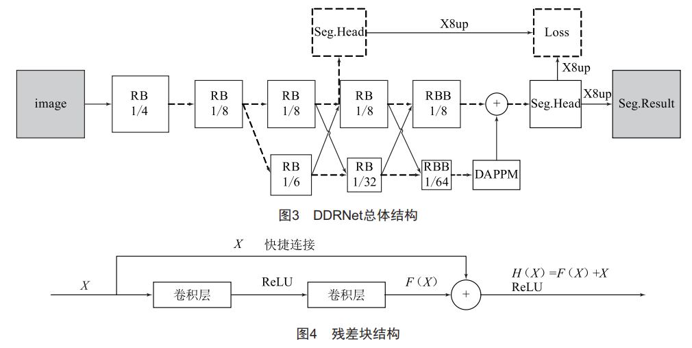 DDRNet全稱是深度雙分辨率網(wǎng)絡(luò)(DeepDual-reSolutionNetworkS),總體結(jié)構(gòu)如圖3所示,輸入圖像在經(jīng)過兩個(gè)殘差塊后,特征提取被分成兩個(gè)具有不同分辨率的平行分支:一個(gè)高分辨率分支(圖中上路分支)生成相對(duì)高分辨率的特征映射,另一個(gè)低分辨率分支通過多次下采樣操作提取豐富的上下文信息。兩個(gè)分支之間橋接多個(gè)雙邊融合以實(shí)現(xiàn)有效的信息融合,并在最后通過add的形式進(jìn)行特征融合,融合后的特征經(jīng)過卷積模塊得到最終的預(yù)測結(jié)果。另外,DDRNet模型提出了能夠極大增加感受野的深度聚合金字塔合并模塊(DAPPM),該模塊比普通的PPM能更充分地提取信息。