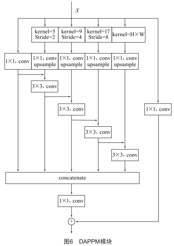 如圖6所示,受MSFNet和ReS2Net的啟發(fā),DDRNet提出了將深度特征聚合與金字塔池化相結(jié)合的DAPPM模塊。該模塊首先通過大尺度的池化核和步長獲得不同分辨率的特征圖,不同分辨率的特征圖經(jīng)上采樣后再以層次殘差的方式進(jìn)行信息融合,融合后的特征通過1×1卷積進(jìn)行壓縮。為了便于優(yōu)化,在壓縮特征上增加了一個(gè)輸入的快捷連接。DAPPM提取的信息比PPM更加豐富。