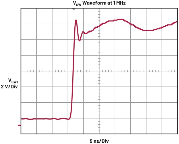 LTC7050的驅(qū)動器與功率回路集成在同一裸片上,并且所有柵極驅(qū)動器的電容都在封裝中。由于取消了鍵合線,每個驅(qū)動環(huán)路中的寄生電感接近于零。與多芯片DrMOS模塊相比,LTC7050開啟和關(guān)閉功率器件的速度要快得多。開關(guān)節(jié)點(diǎn)電壓的典型上升沿短至1ns,如圖2所示。一流的驅(qū)動速度大大降低了轉(zhuǎn)換損耗。高驅(qū)動速度允許LTC7050具有零死區(qū)時間,從而大大降低二極管導(dǎo)通和反向恢復(fù)損耗。