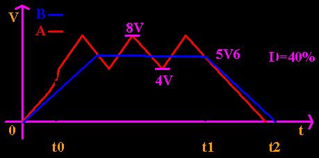 如圖二示在A點(diǎn)處接一個(gè)電容,控制給電容的充電速度,使其電壓上升斜率小于C39上的電壓上升斜率,C39充電時(shí)阻抗大約20K,那我們給A點(diǎn)電容的充電阻抗需要大于20K,那我們選擇一個(gè)200K的電阻給電容充電,阻抗不在一個(gè)級(jí)別上,這樣上升斜率肯定小于三角波的上升斜率,那我們繼續(xù)看畫出此時(shí)A、B兩點(diǎn)的波形進(jìn)行分析如圖三示。