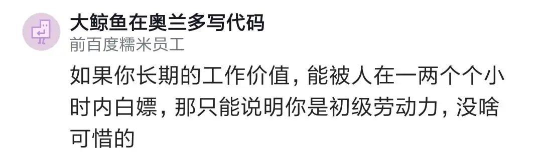 也有人說,如果你長(zhǎng)期的勞動(dòng)價(jià)值能被人在一兩個(gè)小時(shí)內(nèi)白嫖,只能說明你是初級(jí)勞動(dòng)力,沒什么可惜的。