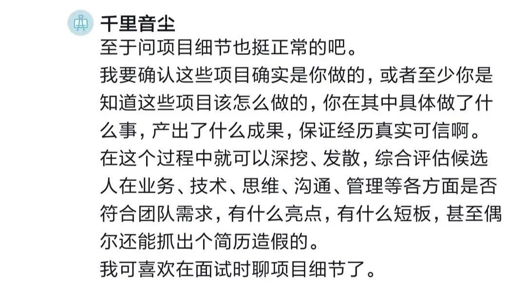 一位面試官喊冤,說面試時(shí)記的不一定是筆記,也可能是面試記錄。問項(xiàng)目細(xì)節(jié)也正常,這樣才能確定是你做的,保證經(jīng)歷真實(shí)可信。