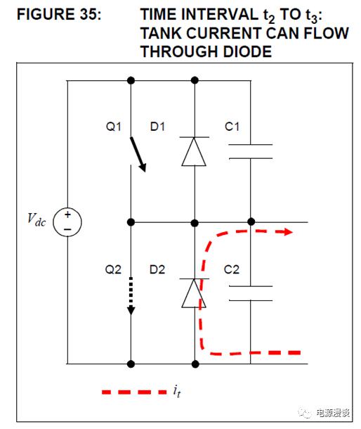 在t2時(shí)刻時(shí),Q1是關(guān)閉的,而諧振電流為正,因此只能流過Q2的體二極管D2,Q2兩端的電壓就非常小,在t2和t3之間的時(shí)刻開通Q2,這個(gè)開關(guān)就會得到ZVS開通的特性,開通損耗非常小。