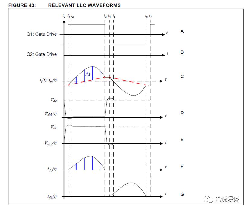 在t0時(shí)刻,電路中的開關(guān)均處于turn off狀態(tài),諧振腔電流中只有磁化電流且為負(fù)電流,這個(gè)電流流入電容中點(diǎn)進(jìn)入Q1的體二極管,此時(shí)若turn on Q1開關(guān),則由于Q1兩端的電壓非常小,則開通損耗就非常小。所以,一般認(rèn)為只要在t0-t1之間的時(shí)刻開通Q1,則Q1的開通損耗非常小,此時(shí)電路處于感性工作區(qū)域,且得到ZVS開通特性。