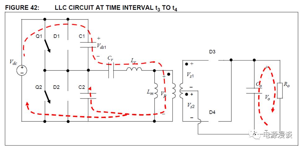 這個(gè)階段當(dāng)Q1還沒有導(dǎo)通的時(shí)候,諧振電流還是流入寄生二極管D1(不向副邊傳遞能量),因此開關(guān)Q1兩端的電壓非常小,此時(shí)若turn on Q1時(shí)可以得到ZVS開通特性,一旦開通Q1后,Vdc就把能量傳遞到輸出端,副邊整流管D3就可以導(dǎo)通。