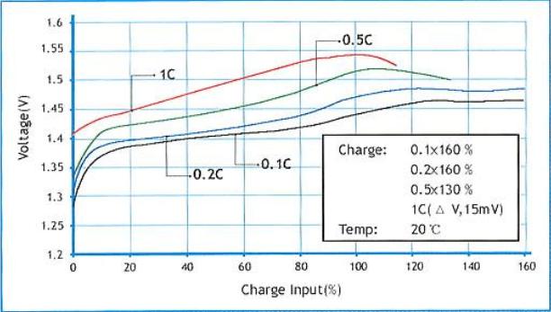從充電曲線可以看出,用不同大小的充電電流,充電曲線是不一樣的。上圖列出的就有4條充電曲線。