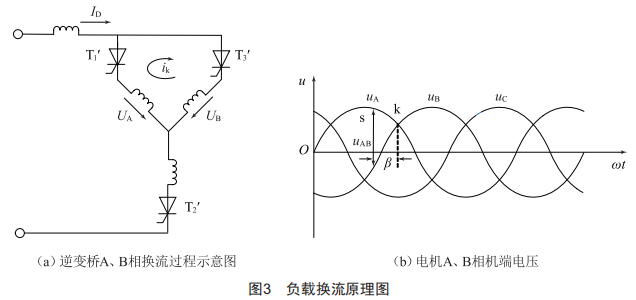 在晶閘管需要換相時,使流過晶閘管電流過零后再施加一定時間的反向電壓,原來導通的晶閘管才能可靠關斷,在此期間觸發(fā)另一支路的晶閘管,該晶閘管因承受正向電壓而被導通,從而實現(xiàn)逆變電路的可靠換流。負載換流原理圖如圖3所示,其中圖3(a)為逆變橋A、B相換流過程示意圖。在換流之前,晶閘管T1'、T2'導通,直流電流ID以A、C相繞組為回路,現(xiàn)在要使電流從AC相換流到BC相,要使待關斷的晶閘管T1'承受反向電壓,應在自然換相點k之前導通晶閘管T3',T1'電流減小為零并承受一段時間反壓后關斷。觀察圖3(b)電機A、B相機端電壓,如果在k點觸發(fā)晶閘管T3',此后電壓uAkuB,晶閘管T1'承受正向電壓將繼續(xù)導通,而T3'經(jīng)過觸發(fā)后承受反向電壓無法導通,將導致?lián)Q流失敗。