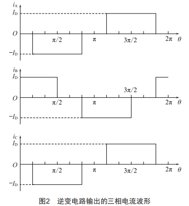 由于直流回路平波電抗器Ls的存在,直流電流ID的幅值在一個周期內(nèi)近似恒定不變,逆變電路按照1204的導電工作方式,在觸發(fā)上橋臂晶閘管導通時,下橋臂處于關斷狀態(tài),三相橋臂觸發(fā)信號相位差1204。忽略逆變電路的換相過程,則逆變電路輸出的三相電流波形如圖2所示。