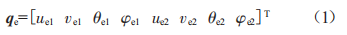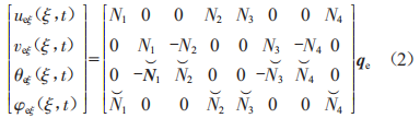 假設(shè)單元軸段為各向同性的圓截面軸,且單元內(nèi)部橫截面面積處處相同:單元軸段材料為線彈性材料,彈性模量表示為Ee:單元內(nèi)任意橫截面在變形后仍為平面,但不一定與中性軸垂直,即考慮剪切變形。單元的節(jié)點位移向量可寫成式(1):