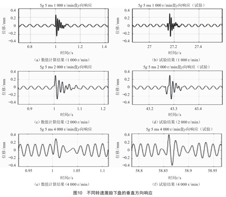 盤受基礎(chǔ)脈沖激勵響應(yīng)的以上變化趨勢在試驗和仿真結(jié)果中都有較好的體現(xiàn),驗證了本文模型和分析方法的正確性。