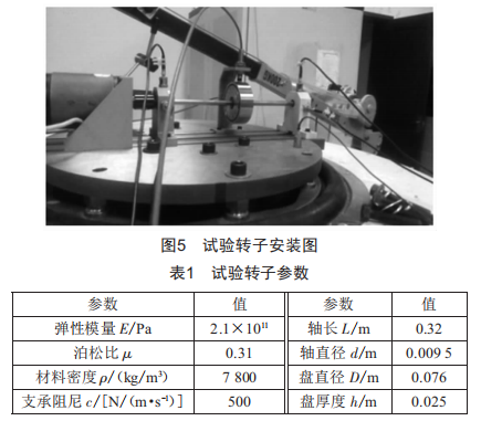采用Jeffcott轉(zhuǎn)子試驗器驗證本文的理論計算,試驗轉(zhuǎn)子及安裝如圖5所示,轉(zhuǎn)子系統(tǒng)參數(shù)如表1所示。試驗轉(zhuǎn)子兩端為軸承支承,由電機驅(qū)動轉(zhuǎn)軸。在盤的相互垂直的兩個方向上安裝電渦流位移傳感器,在支承的水平方向和豎直方向安裝加速度傳感器。位移和加速度信號測量裝置如圖6所示,數(shù)據(jù)采集界面如圖7所示,振動臺及控制軟件如圖8所示。